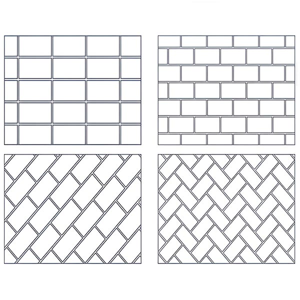 A forma retangular (15,6 x 7,6 cm) permite vários padrões. Cada conjunto de 10 azulejos cobre cerca de 0,12 metros quadrados, perfeito para designs criativos.