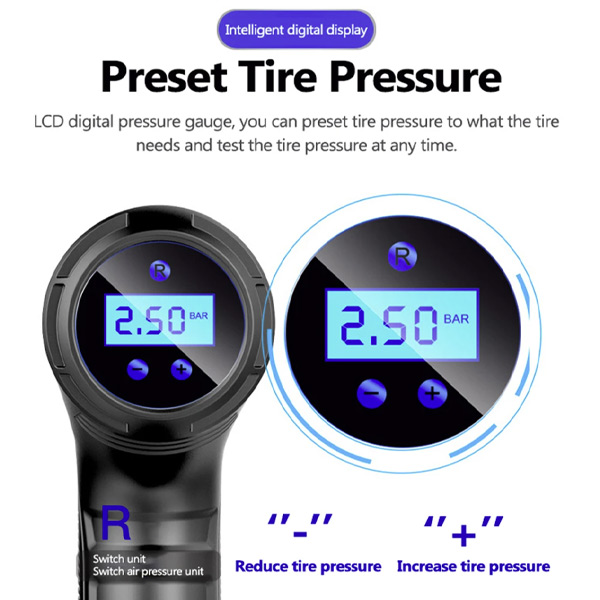 O ecrã digital inteligente apresenta uma leitura precisa da pressão atual dos pneus, permitindo-lhe acompanhar as variações de pressão durante o enchimento.