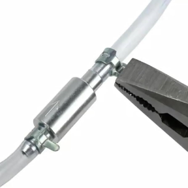 Ligar a mangueira ao sistema de travões da sua mota é muito simples com as presilhas incluídas. Esta configuração rápida permite iniciar de imediato o processo de purga do fluido de travões.