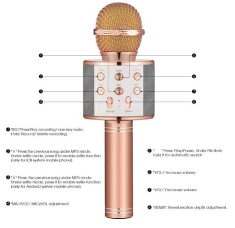 - Microfone multifunções 3 em 1 — A principal função deste microfone Bluetooth é DIVERTIR-SE! O karaoke é sem dúvida a função principal, mas este microfone também permite gravar músicas e modificar a sua voz. Mas, definitivamente, o mais importante é divertir-se onde e quando quiser.