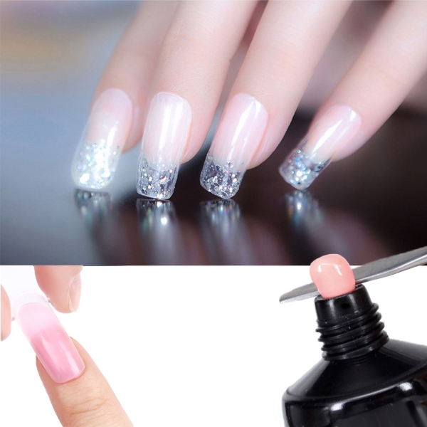 Aplica uma camada fina de poly gel sob a unha artificial que vas a colar na tua unha. Depois de secar sob a luz LED, simplesmente remove a unha artificial.