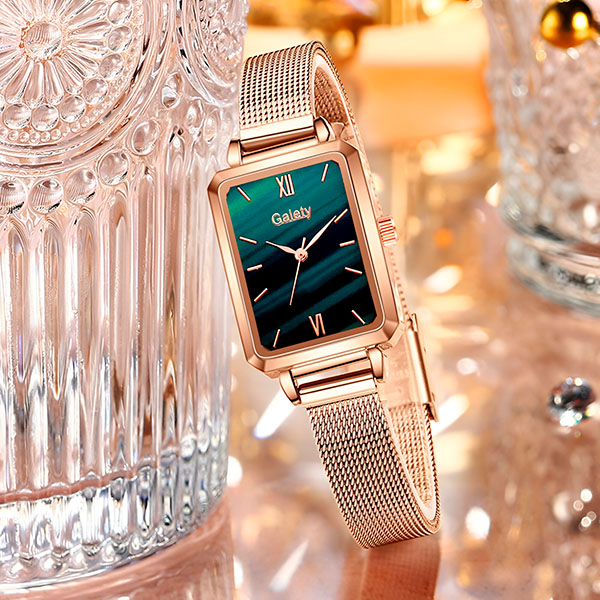 Este relógio tem uma cor brilhante em ouro rosa e um lindo mostrador verde. Adiciona estilo a qualquer vestido, jeans ou roupa formal.